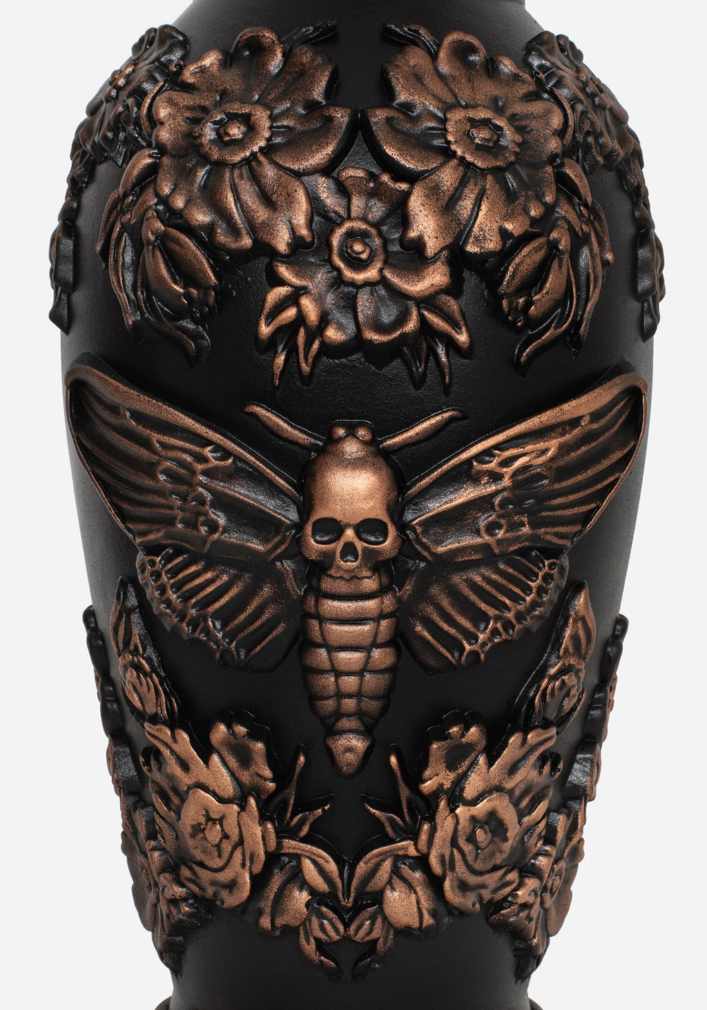 Elegant black floral death moth design, accented with shimmering bronze gilding