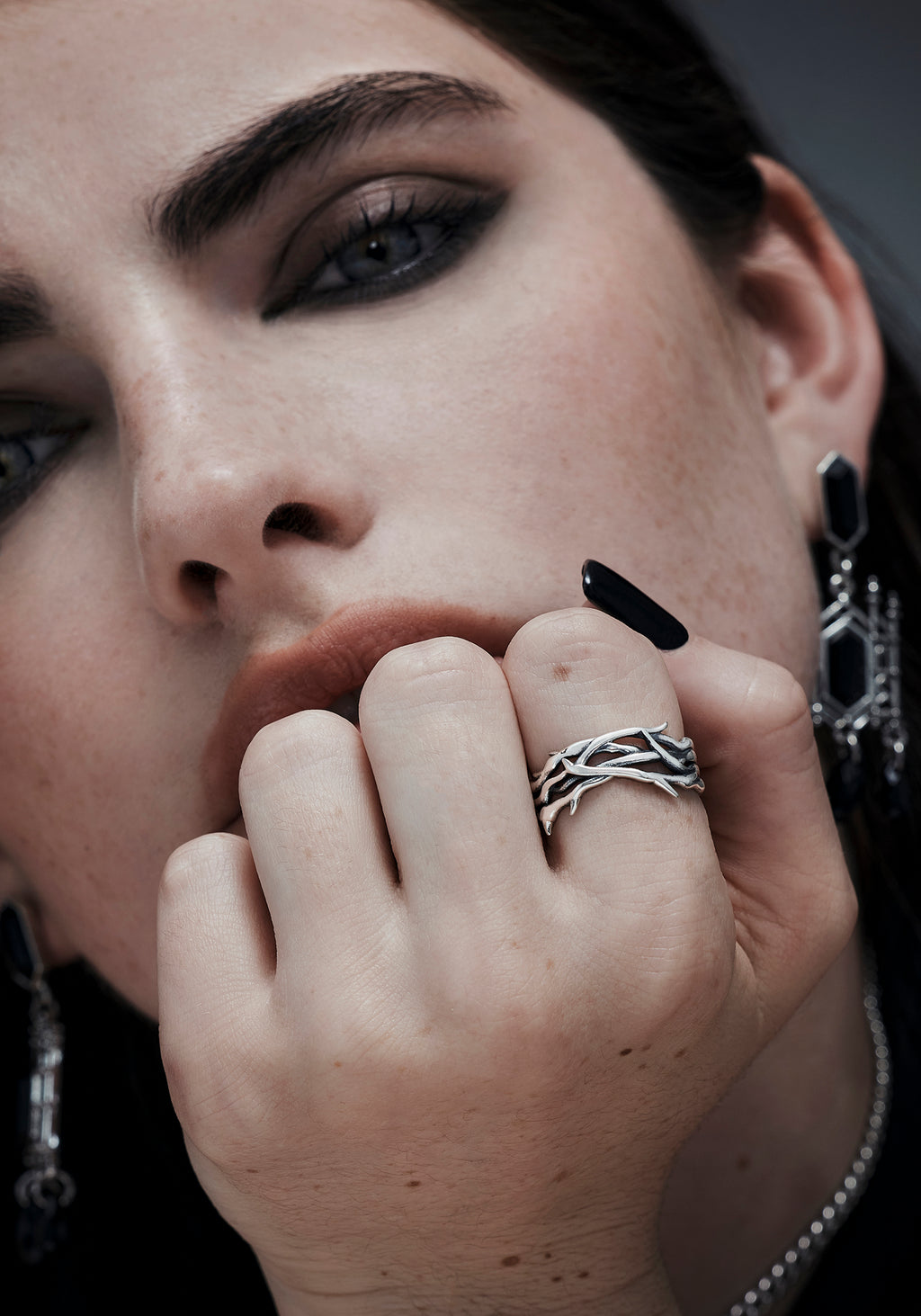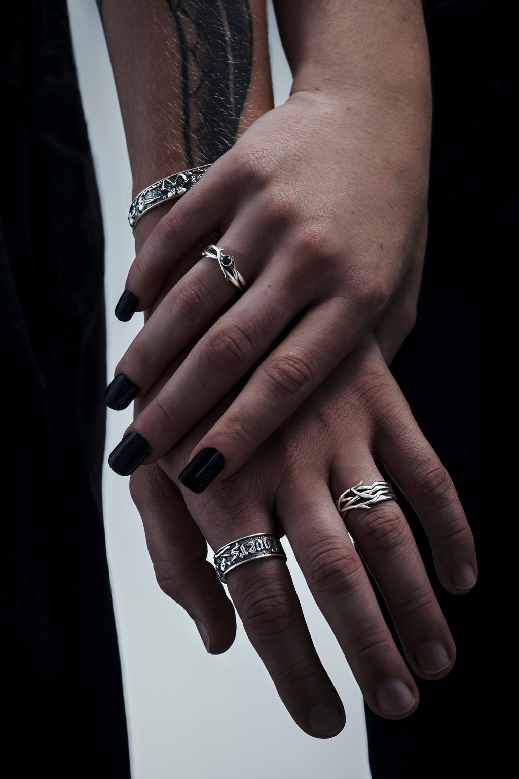 Where the rose chooses its keeper, and the thorn its pair… the Rosethorn offers a wide sterling silver ring with intricate rose thorn detailing, blending gothic elegance with timeless symbolism.