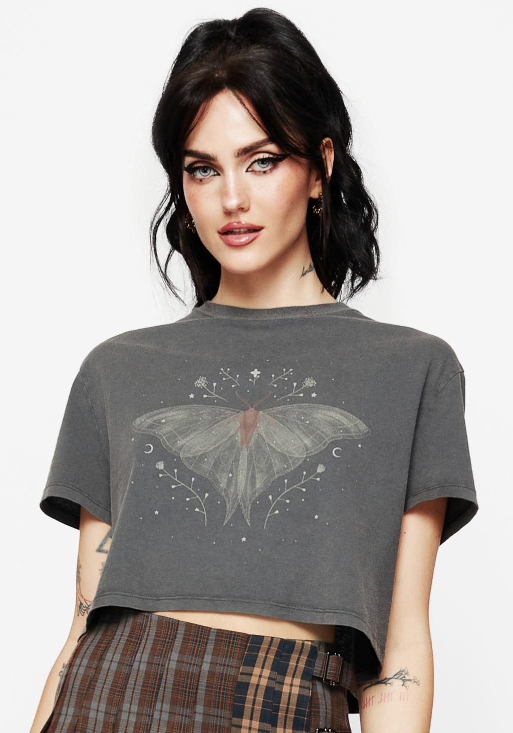 • Grey Moth, Celestial & Flower Print Cropped T-Shirt