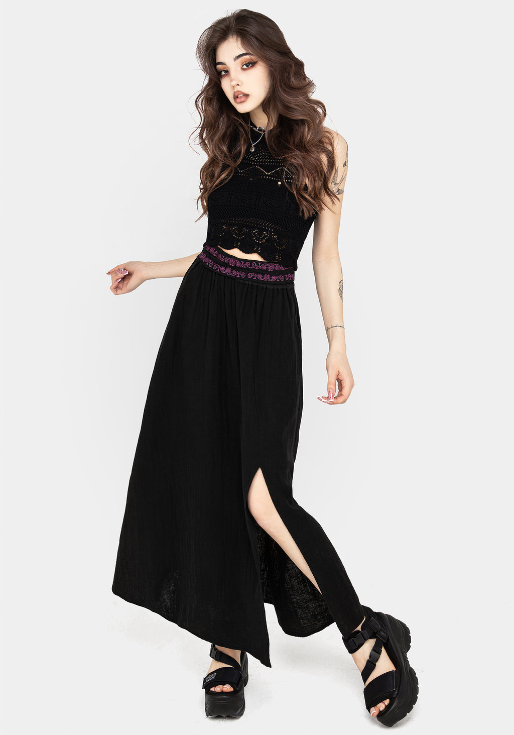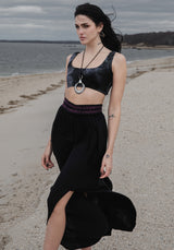 - Rich purple Celtic-inspired floral embroidery on front belt
