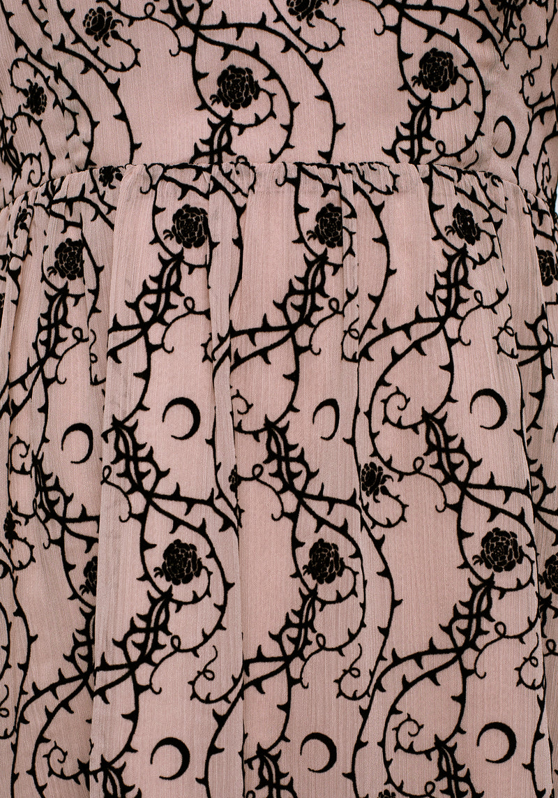 - Black flocked velour rose, thorns & moon design on a soft pastel pink base