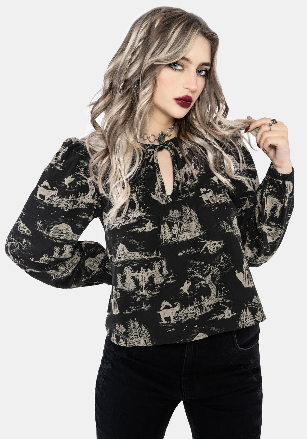 • Pagan Village Scenery Print, Goats, Crows, Twisted Tree