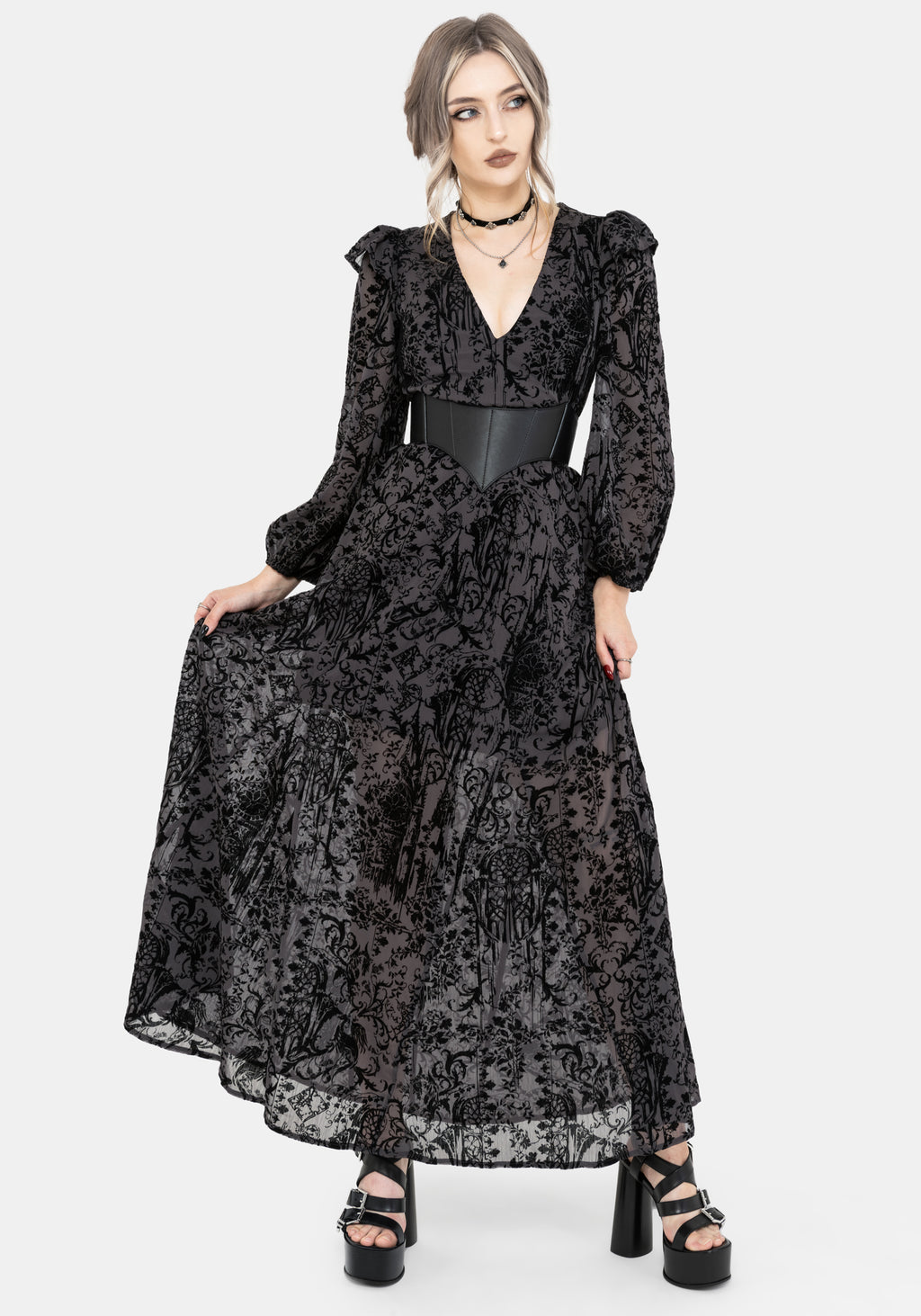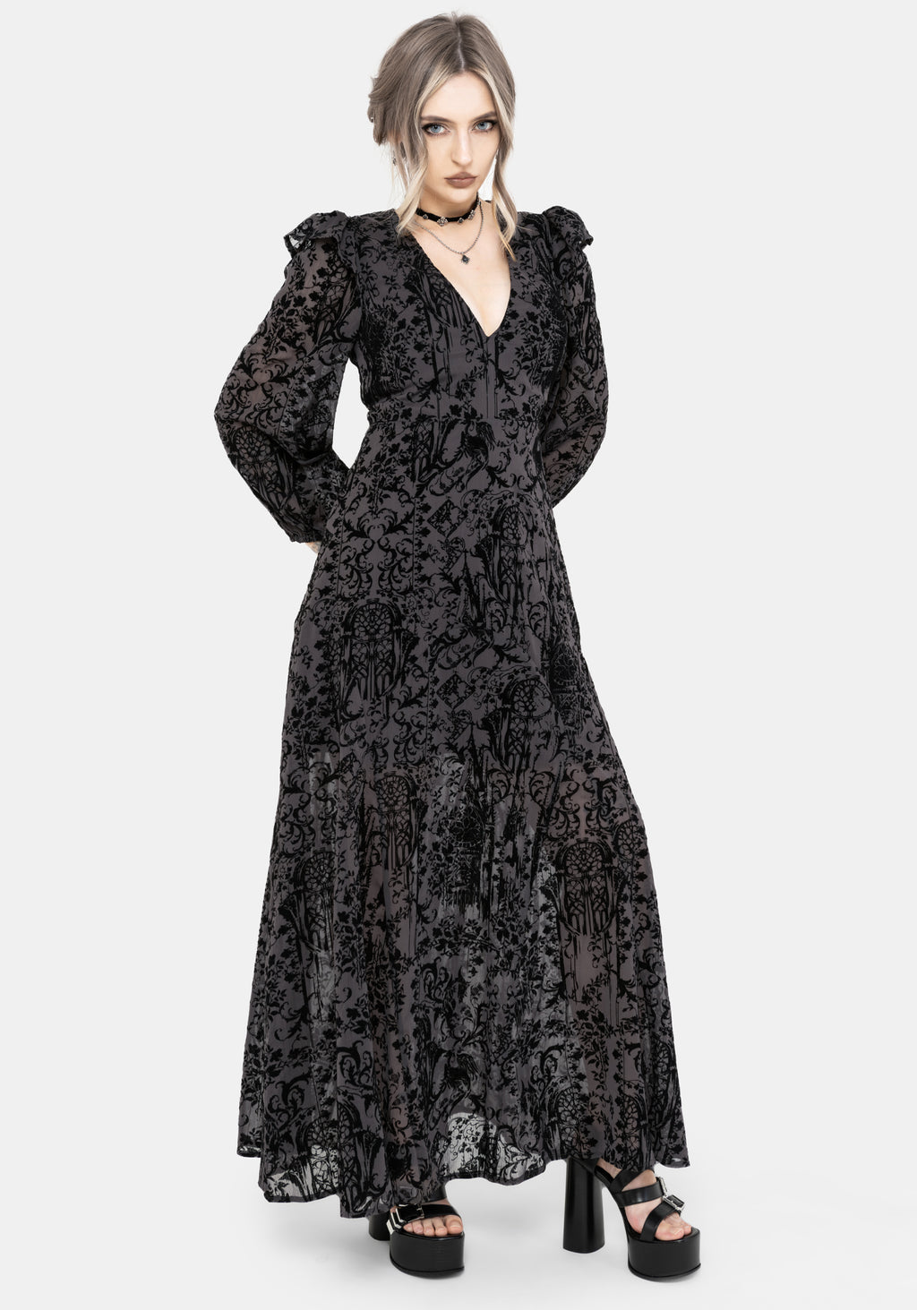 Thorned Flocked Chiffon Castle Print Frill Neck Maxi Dress