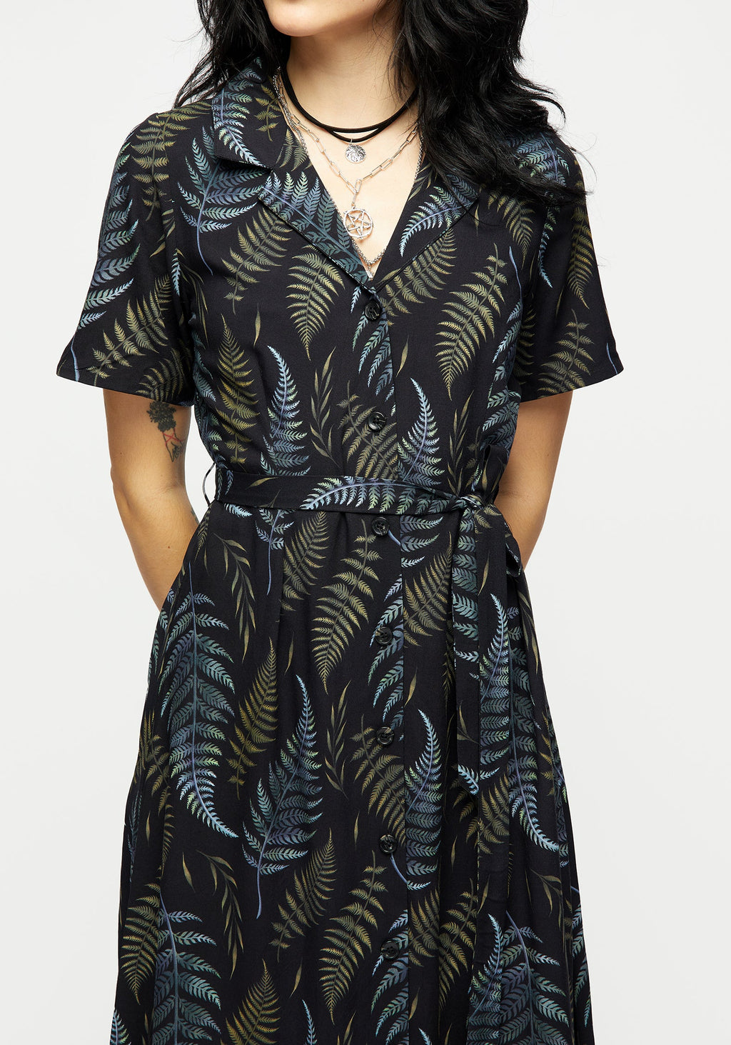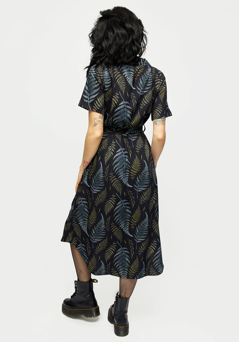 - Black fern print button-up midi shirt dress
