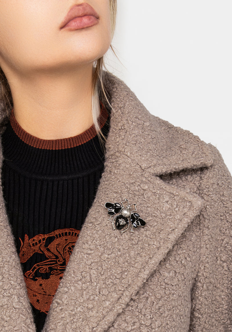 - Silver & black bee brooch on lapel