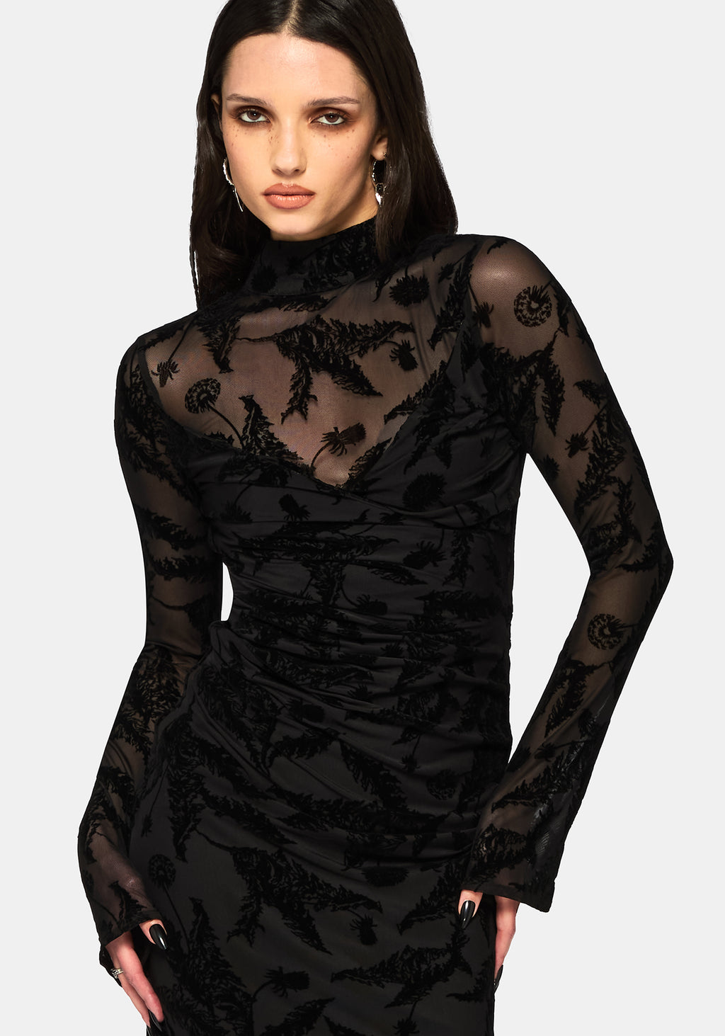Cimora Dandelion Flocked Mesh Ruched Midaxi Dress