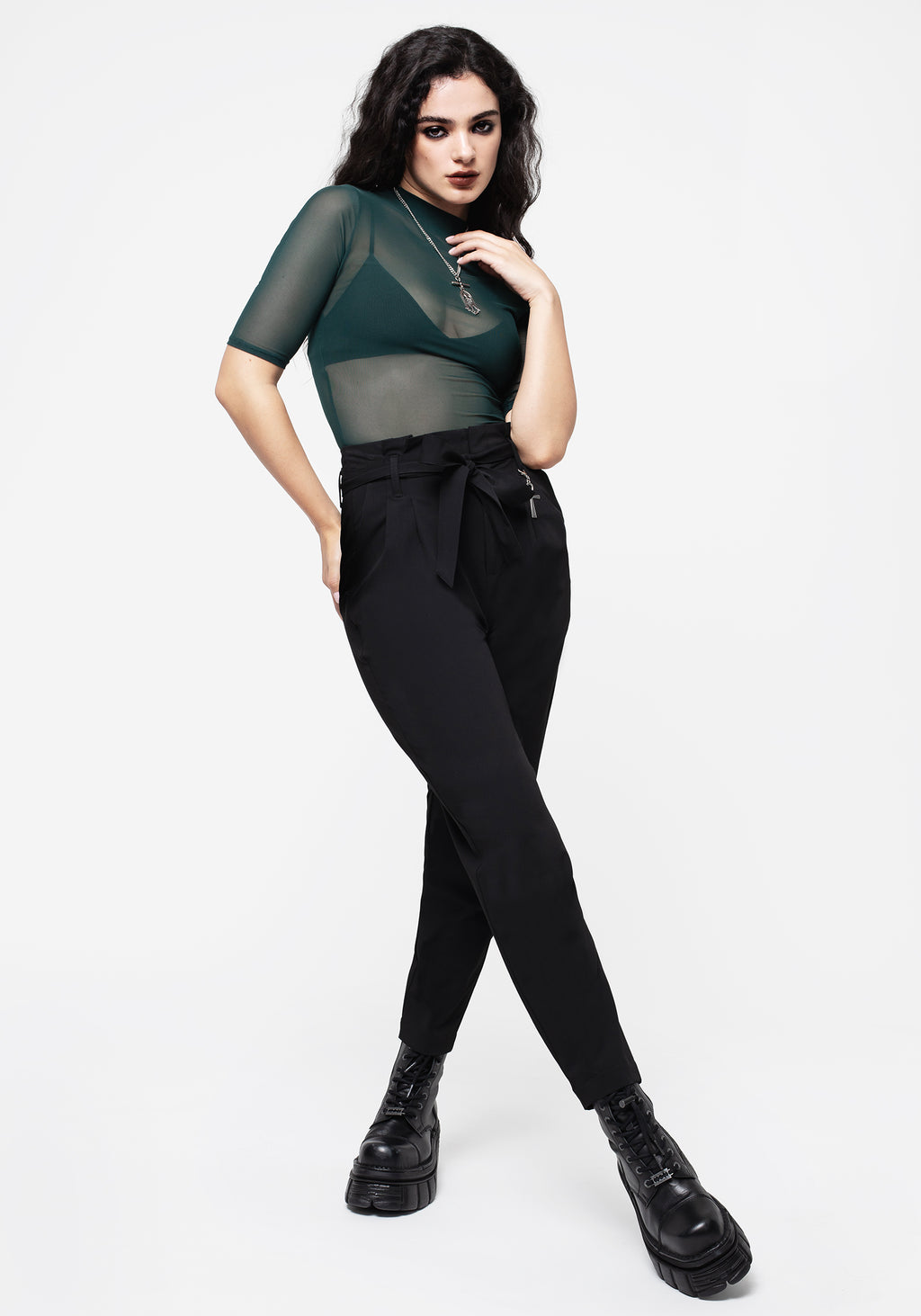 - Hook & bar zipper fly with a gathered paperbag waistband