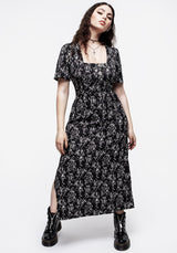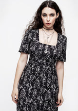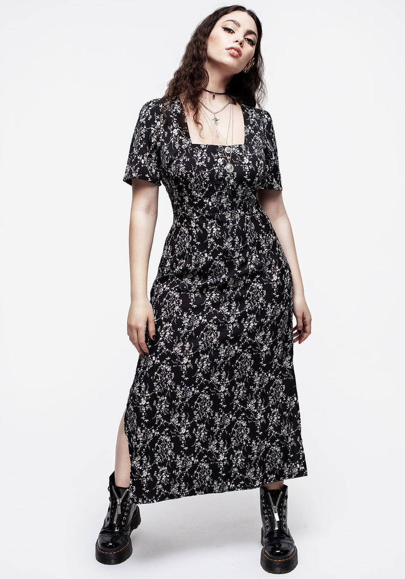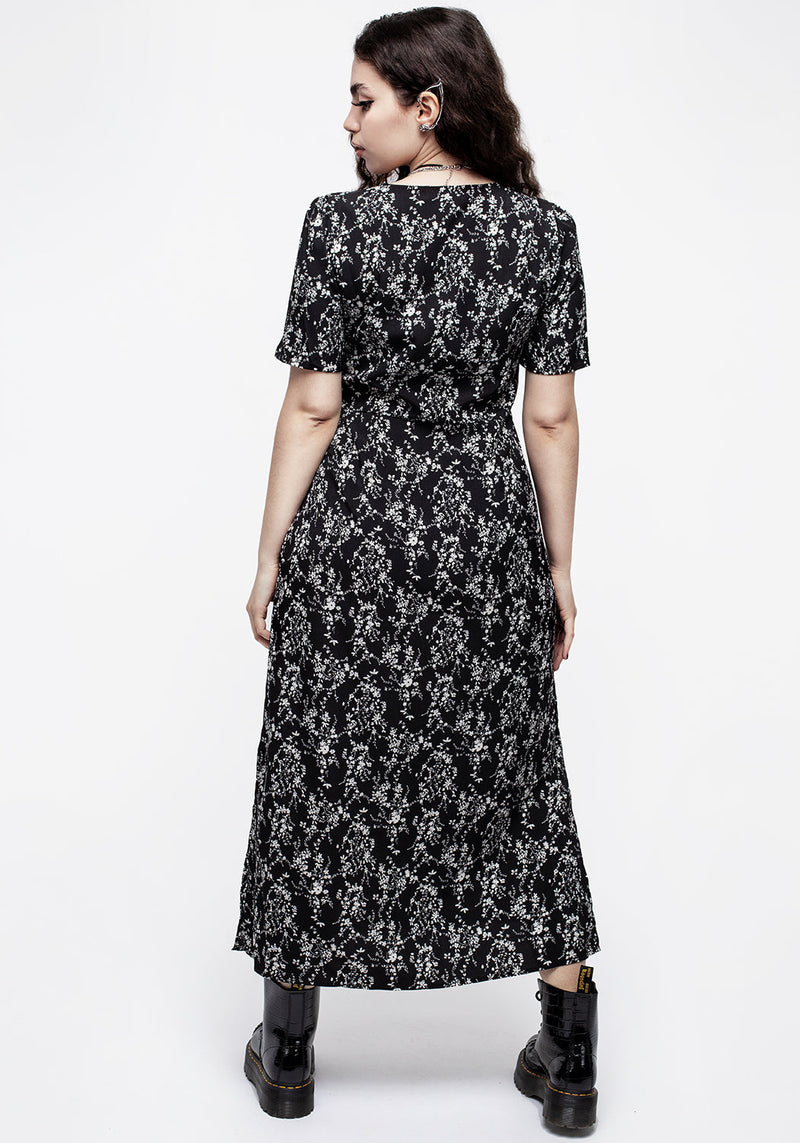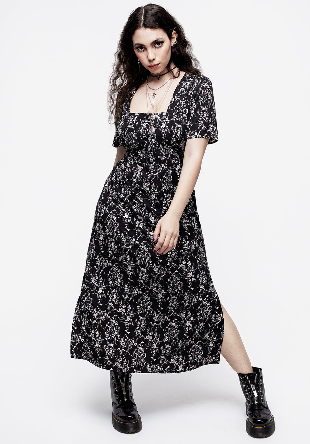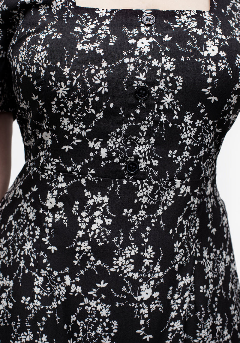 - Non-stretch fabrication with a delicate white floral print on a black base
