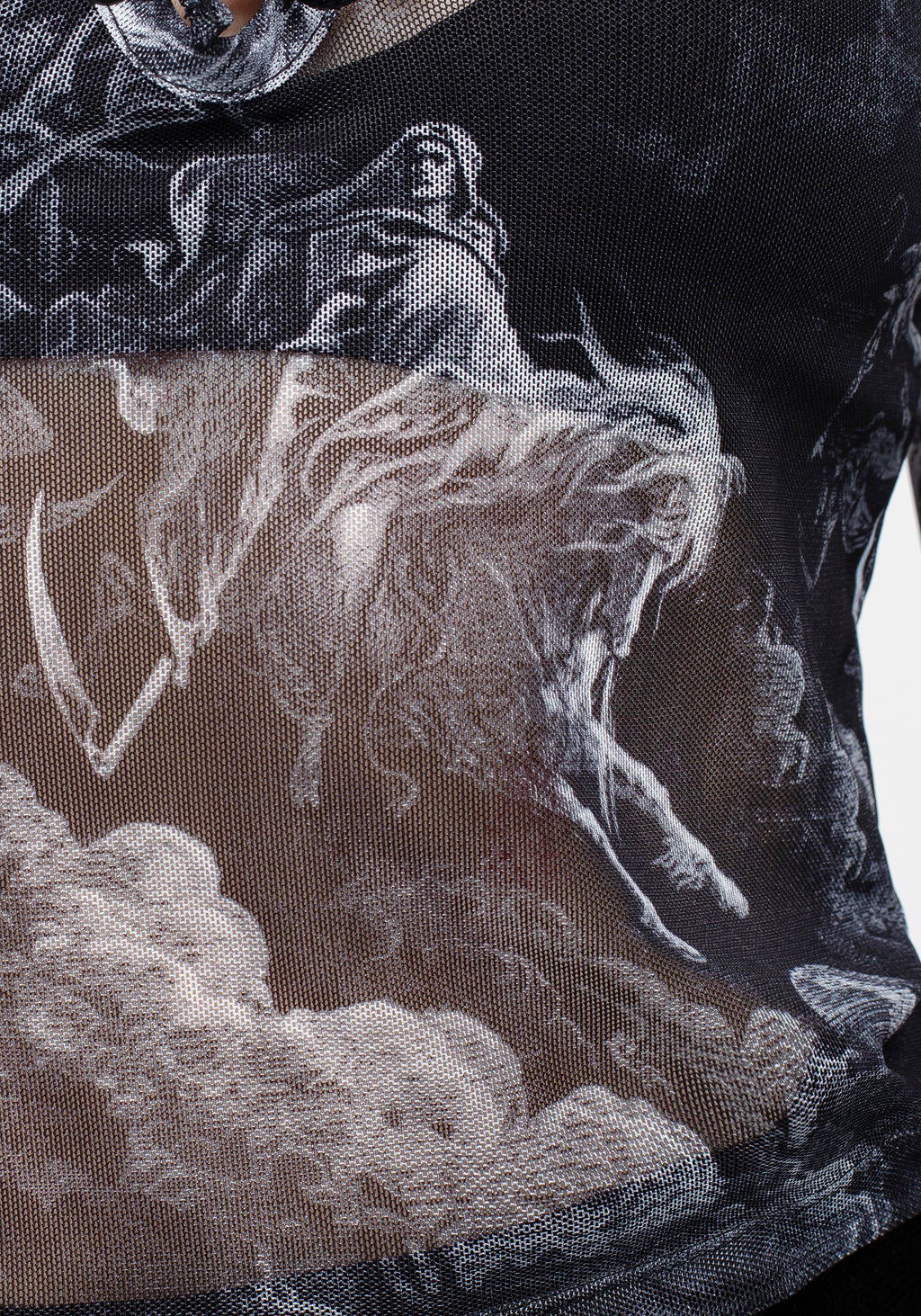- Sheer black mesh fabrication with a macabre all-over print featuring Death on the Pale Horse