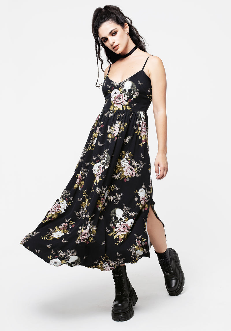 - Gothic floral rose, skull & butterfly print on a rich black base