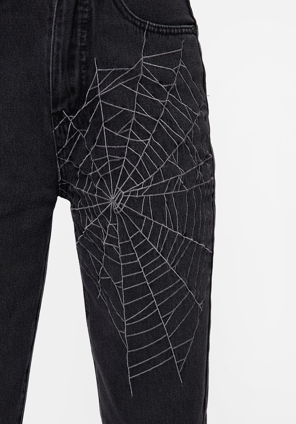 - Washed black spiderweb embroidered denim mom jeans