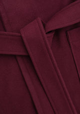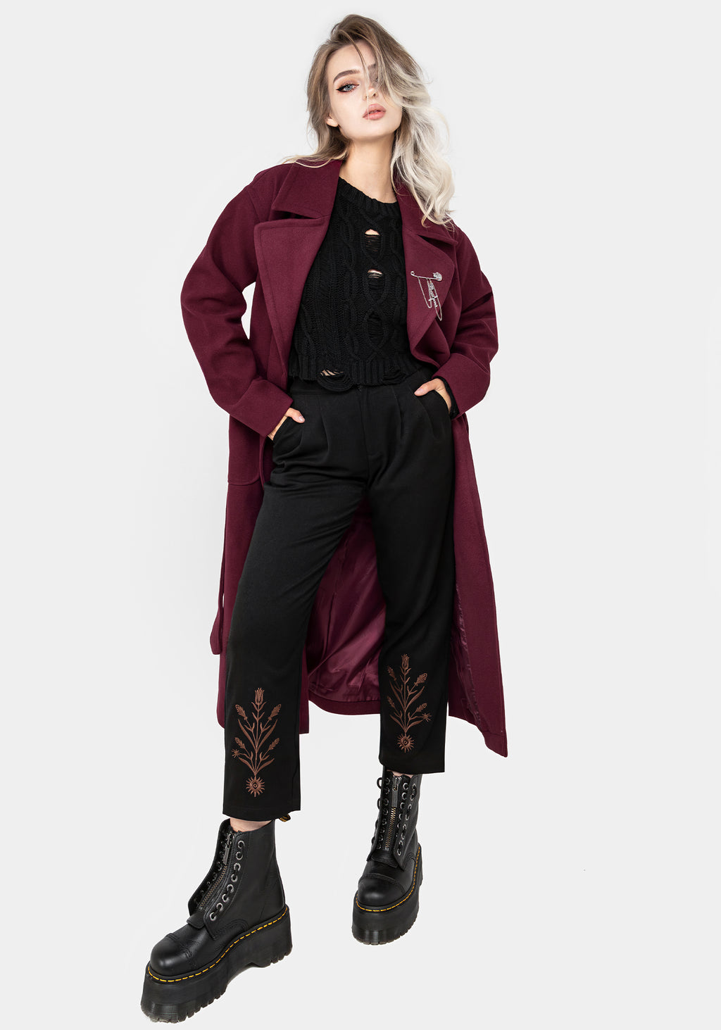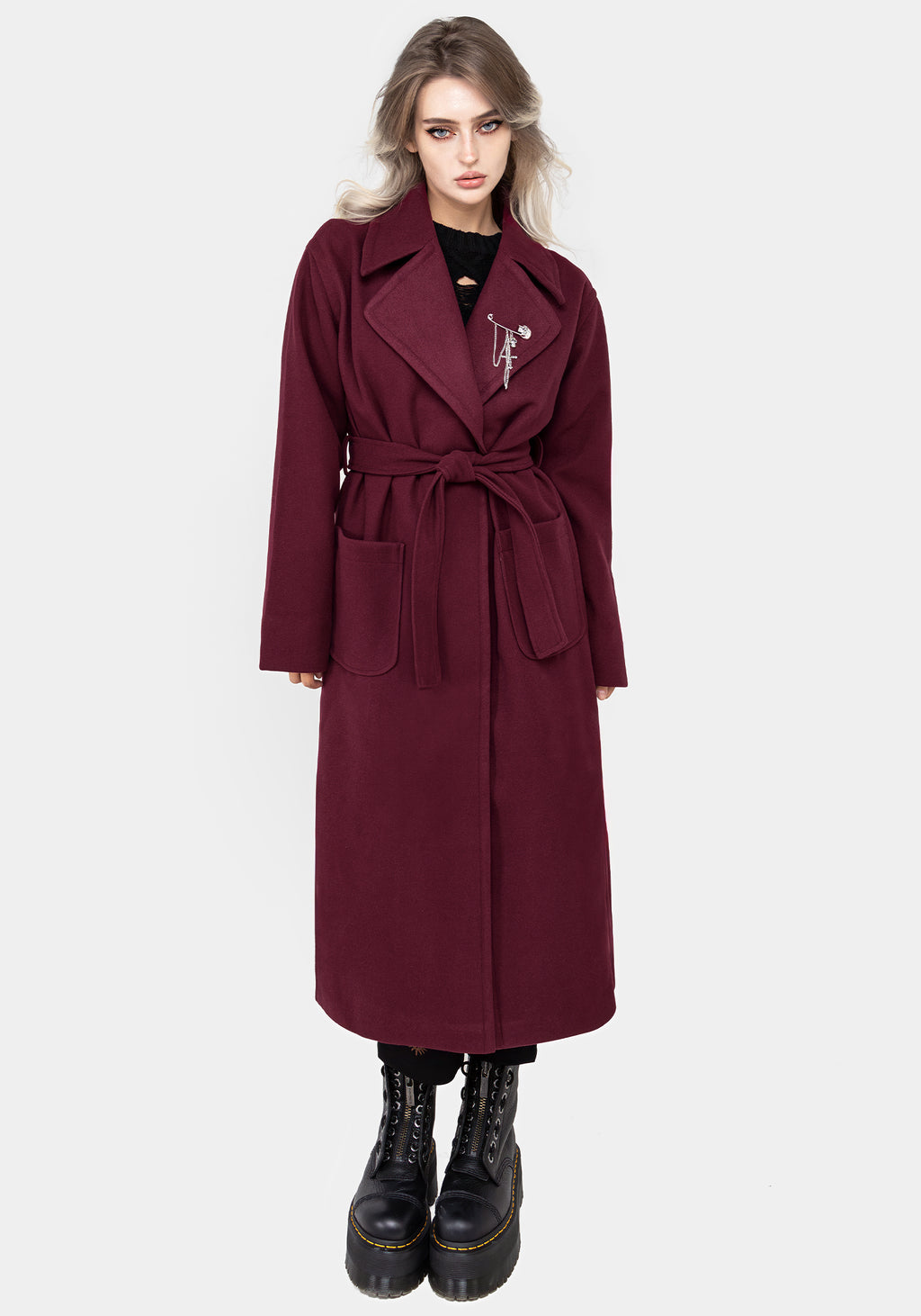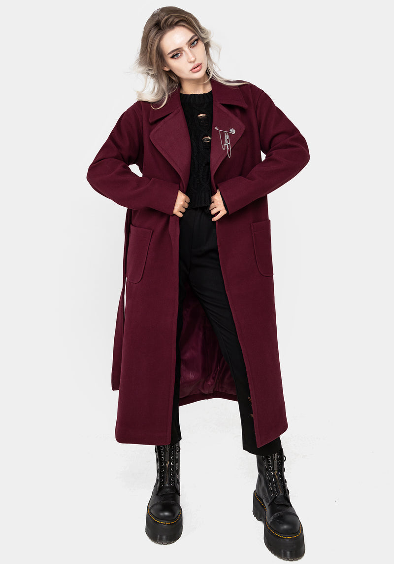 - Raspberry red belted coat with skull safety pin brooch