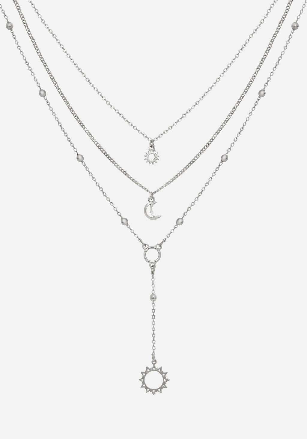 The silver sun opens the mind and lights the way forward . Our bestselling Helios choker gets an upgrade into an equally beautiful, layered necklace. Two delicate chains suspend moon & sun charms. The bottom chain is punctuated with tiny silver balls and a drop pendant which harks back to the original choker. Delicate but strong, like all your favourite goddesses.