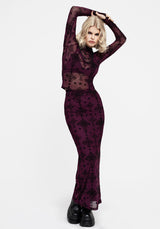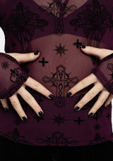 - Stretchy sheer mesh fabrication in a rich purple with flocked ornate crucifix design