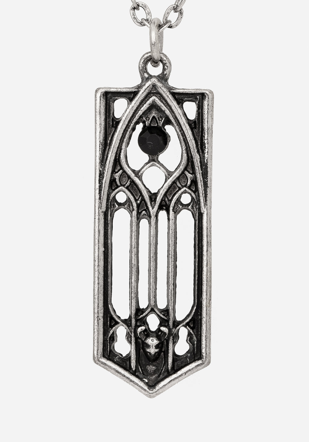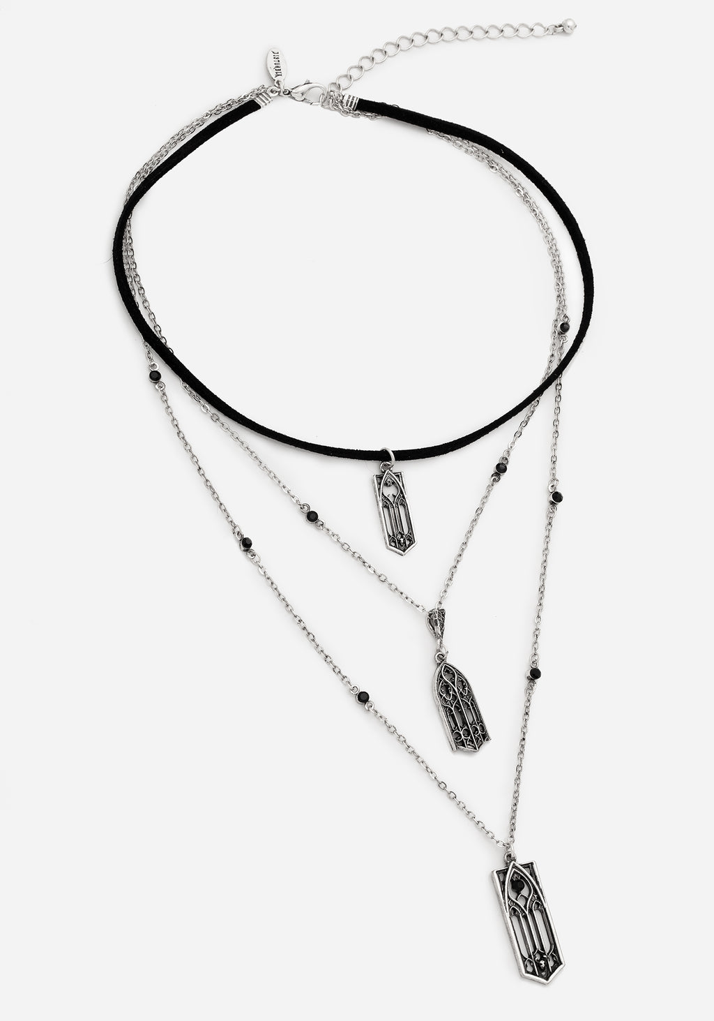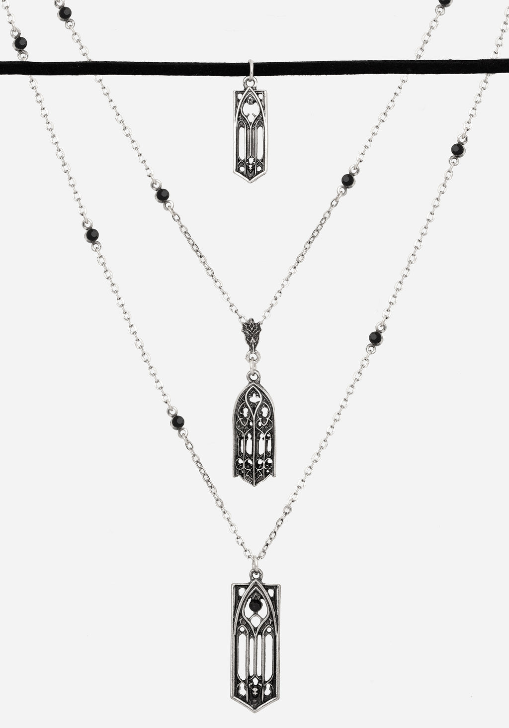 Jewellery for those obsessed with all things Gothic architecture! Build your next look around this layered necklace. Its three staggered pendants are modelled after the dramatic arched windows you’d see in magnificent Middle Age buildings. A faux suede choker necklace contrasts from two draping silver chains dotted with dainty black gems. All three necklace lengths fasten with a single lobster clasp for an easy layered look. An accessory fit for any creature of the night.