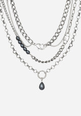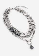 A grungy twist on a classic pearl necklace! This dimensional piece features rolo, curb, figaro & link chains in varying thicknesses for a tangle-free layered look without the fuss. Add a smattering of imitation grey pearls & a couple of ornamental clasps, and you have a quirky necklace for eclectic styling.