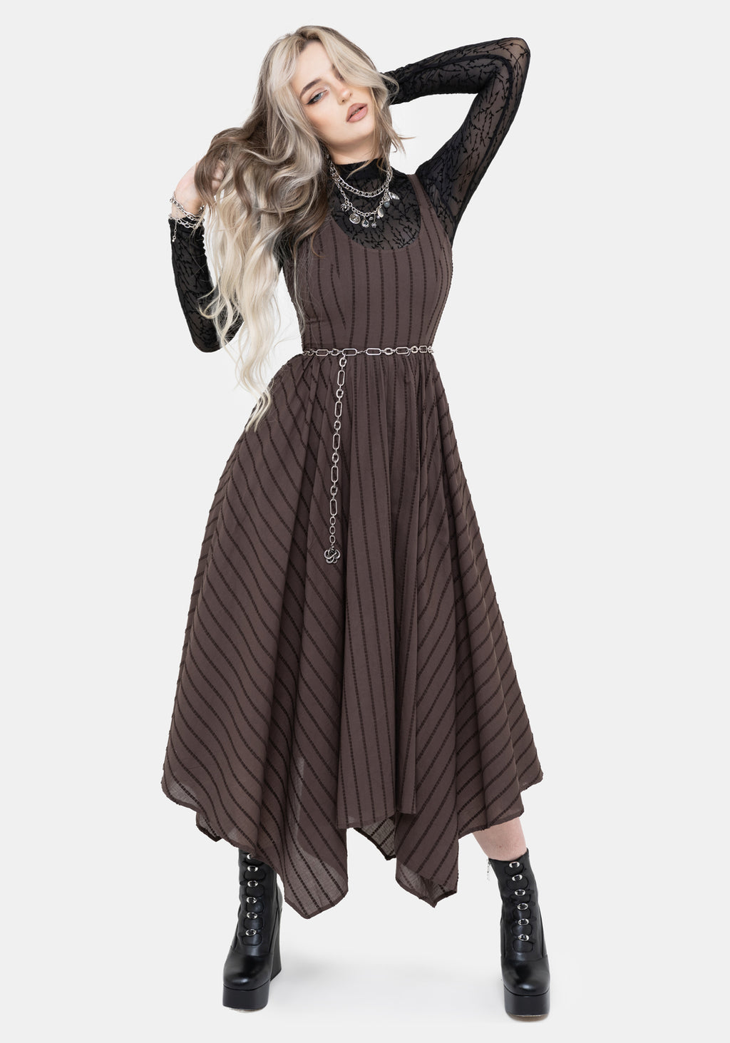 • Brown Striped Handkerchief Hem Midaxi Dress