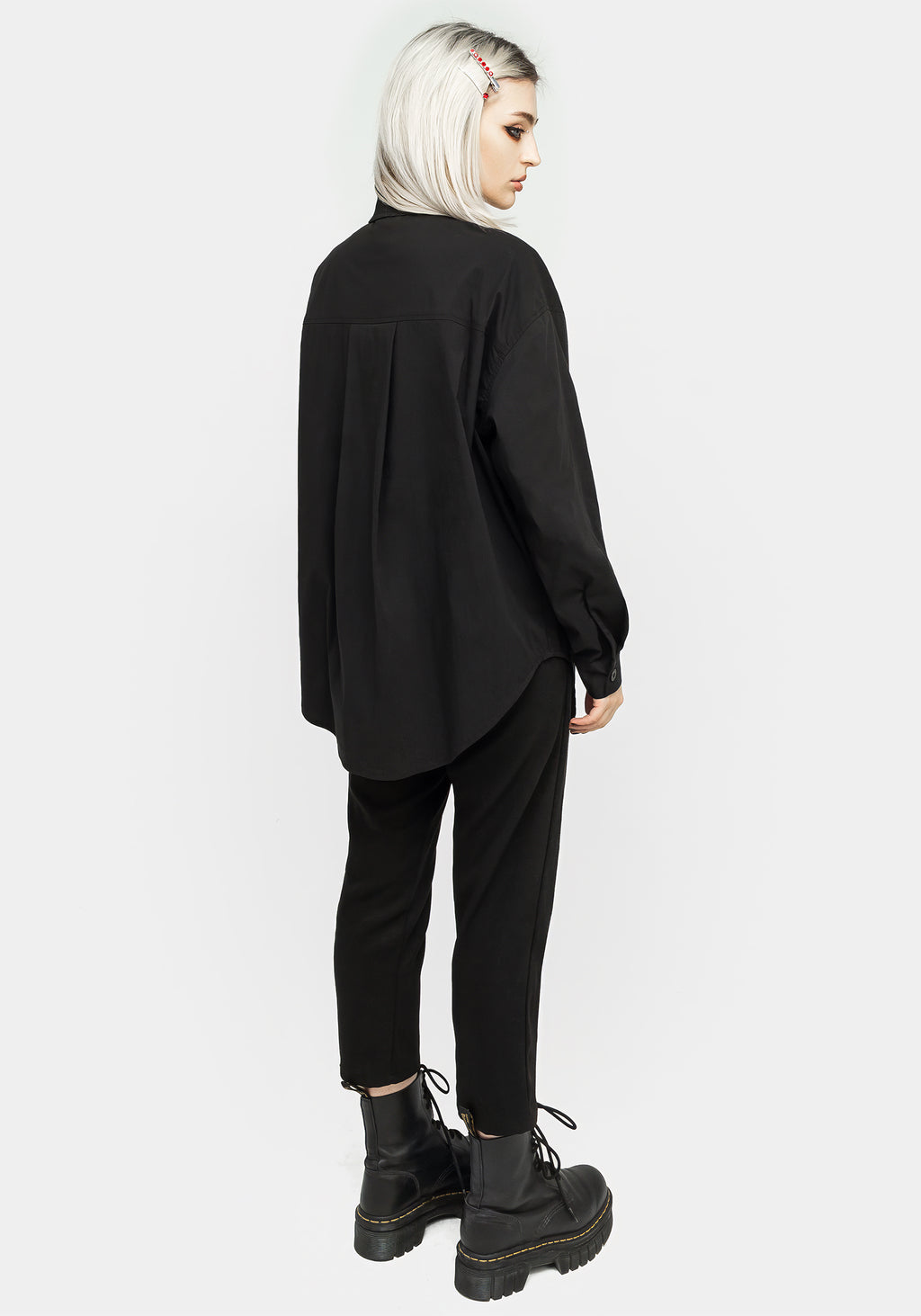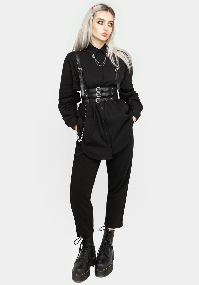 - Buttoned front & cuffs embellished with a silver skeleton hands collar chain