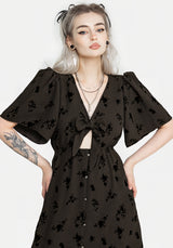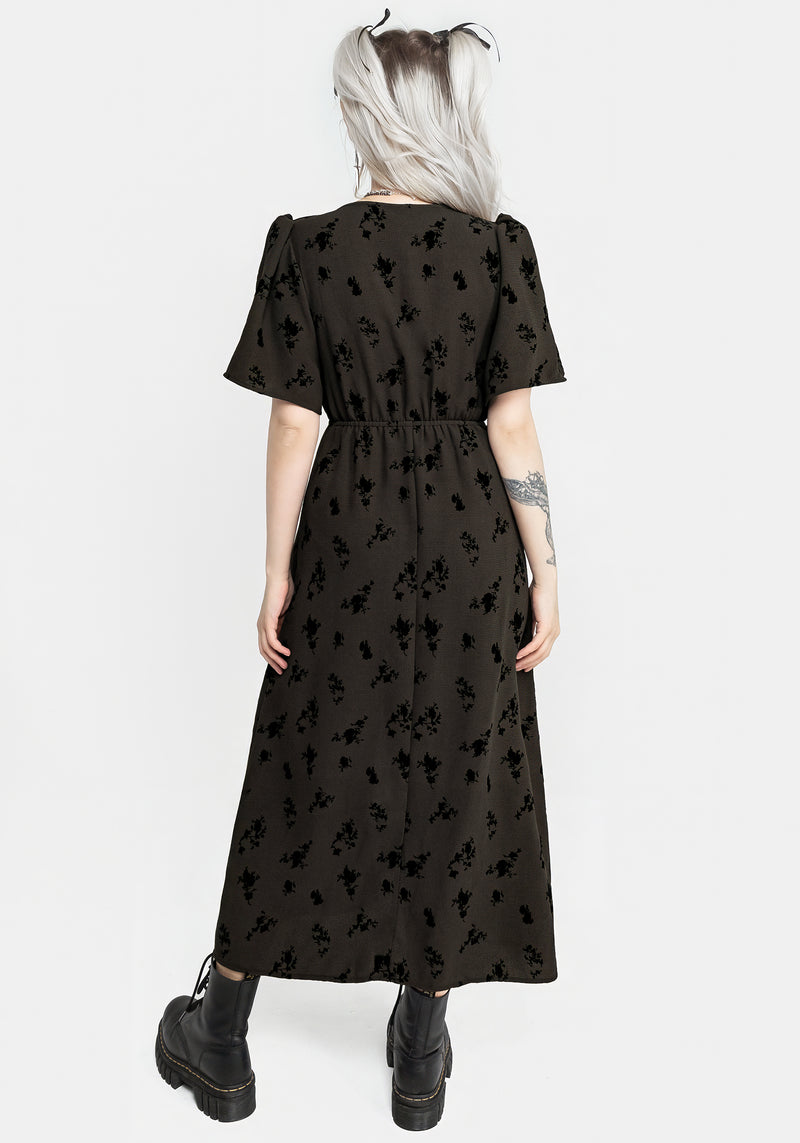 - Sturdy woven fabrication in a dark khaki brown shade embellished with black flocked florals