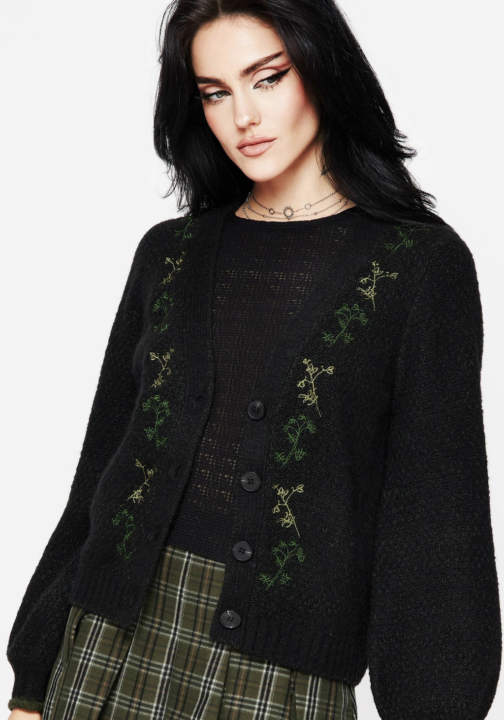 - Green floral embroidered knit crop cardigan
