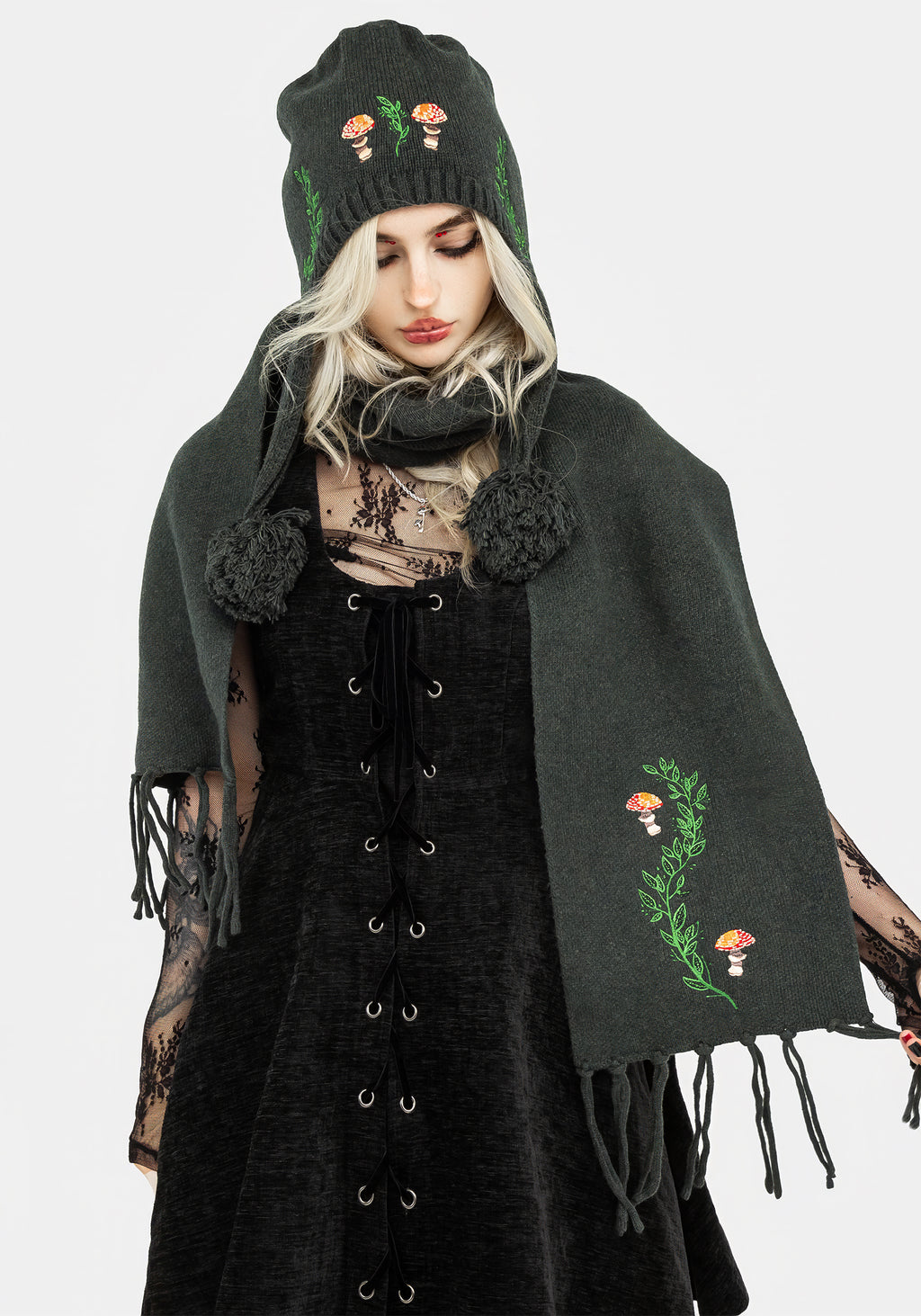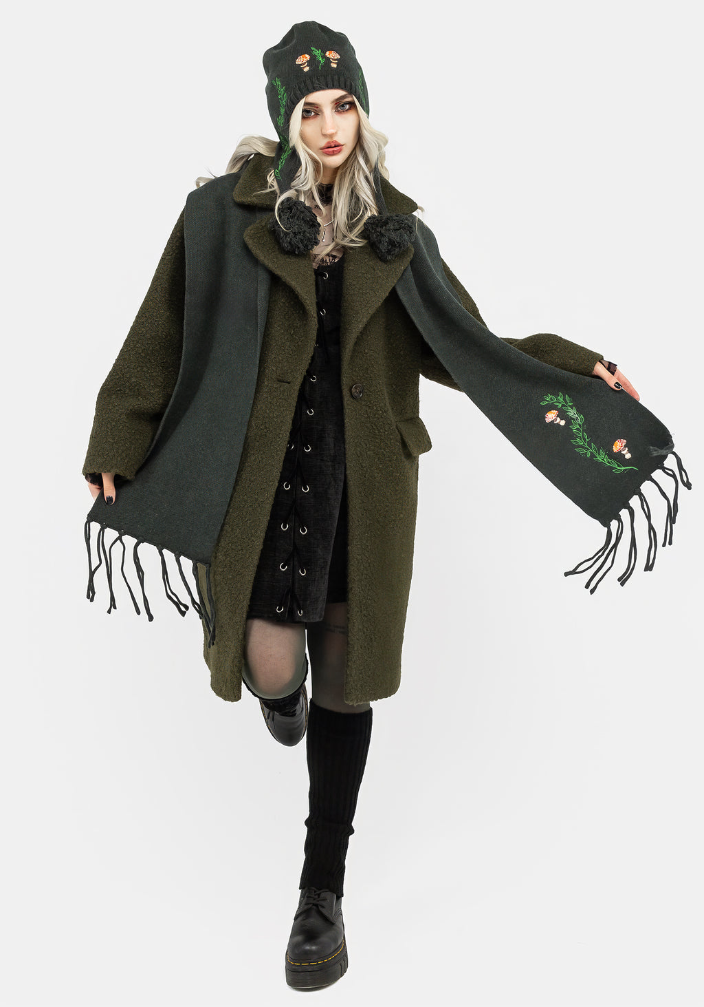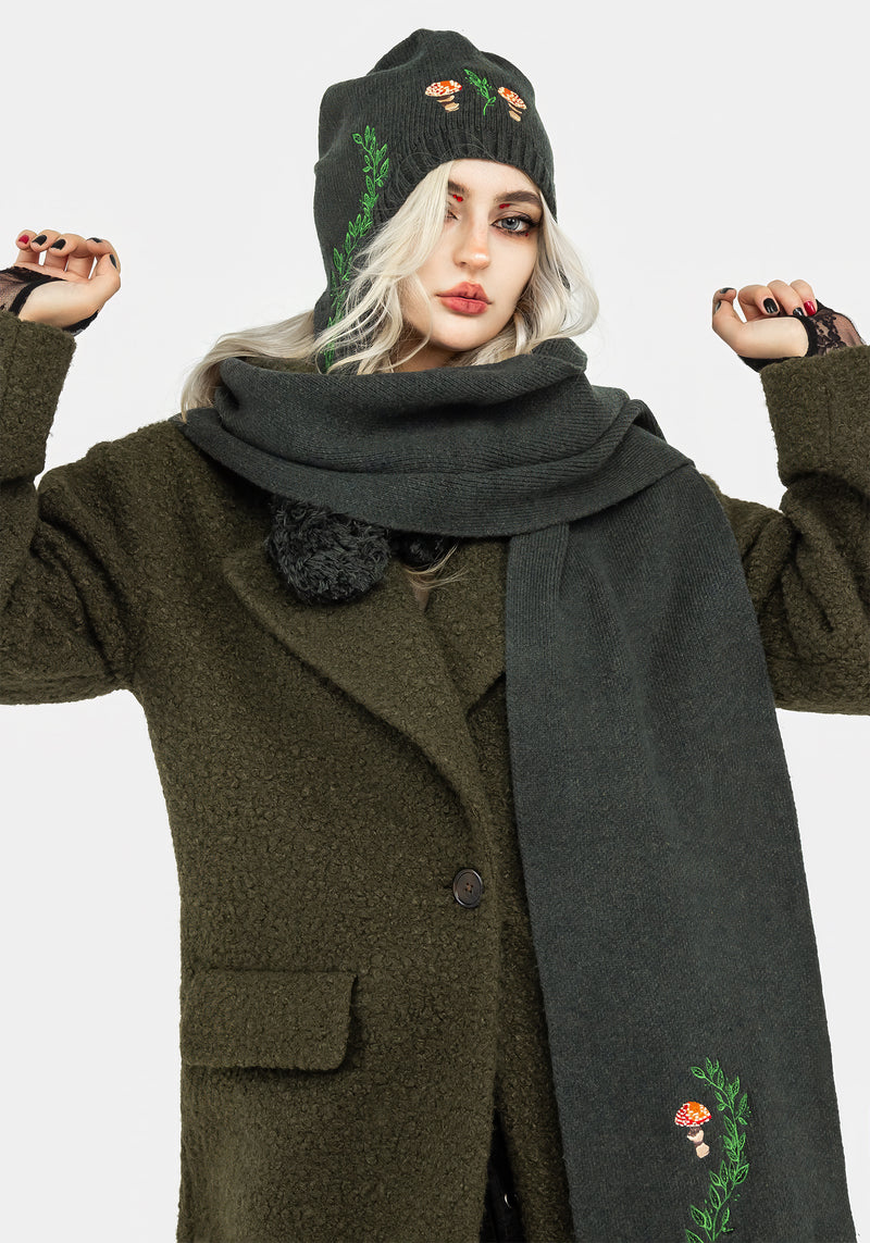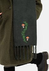 - Dainty red & bright green leafy mushroom embroidery on ends