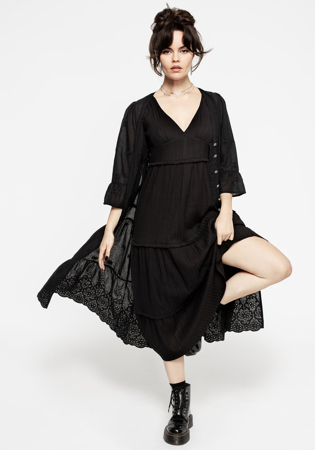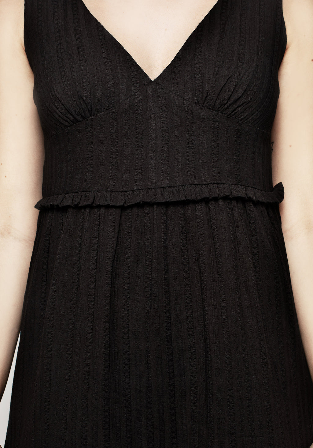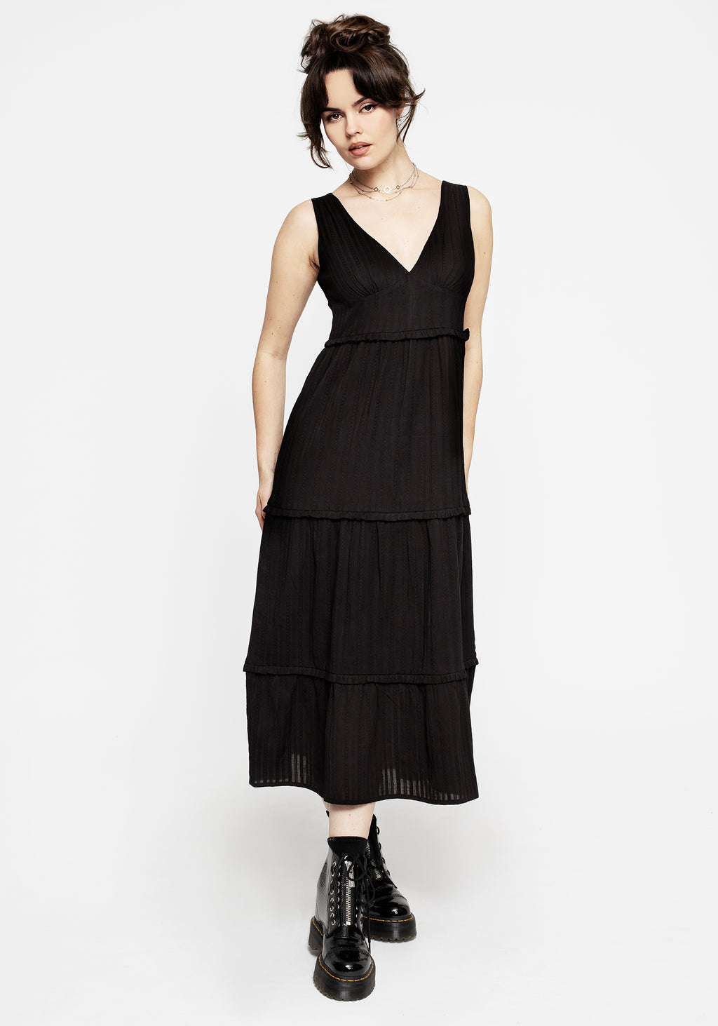 - Black textured V-neck tiered midaxi dress