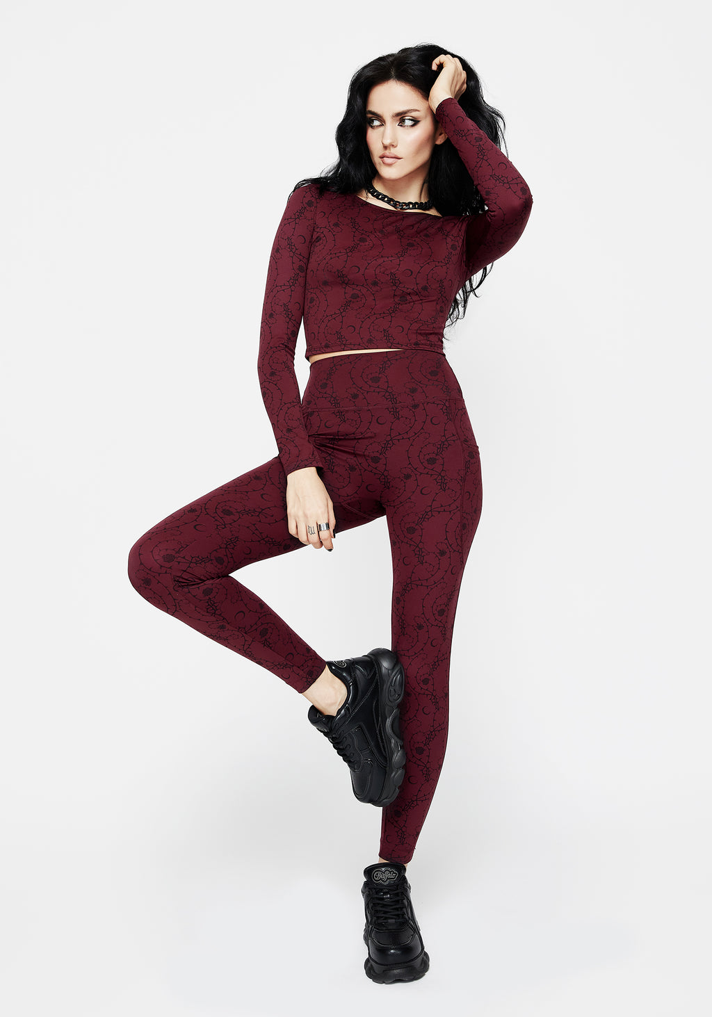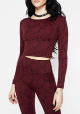 - Burgundy thorn print long sleeve crop top