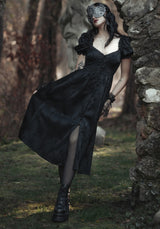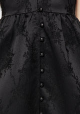 - Black floral jacquard midi dress with button front