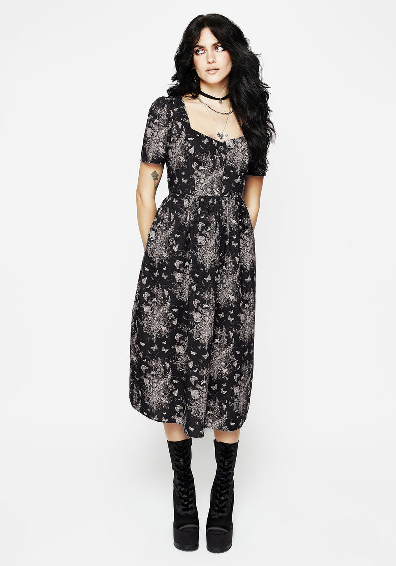 - Black floral butterfly print button front midi dress