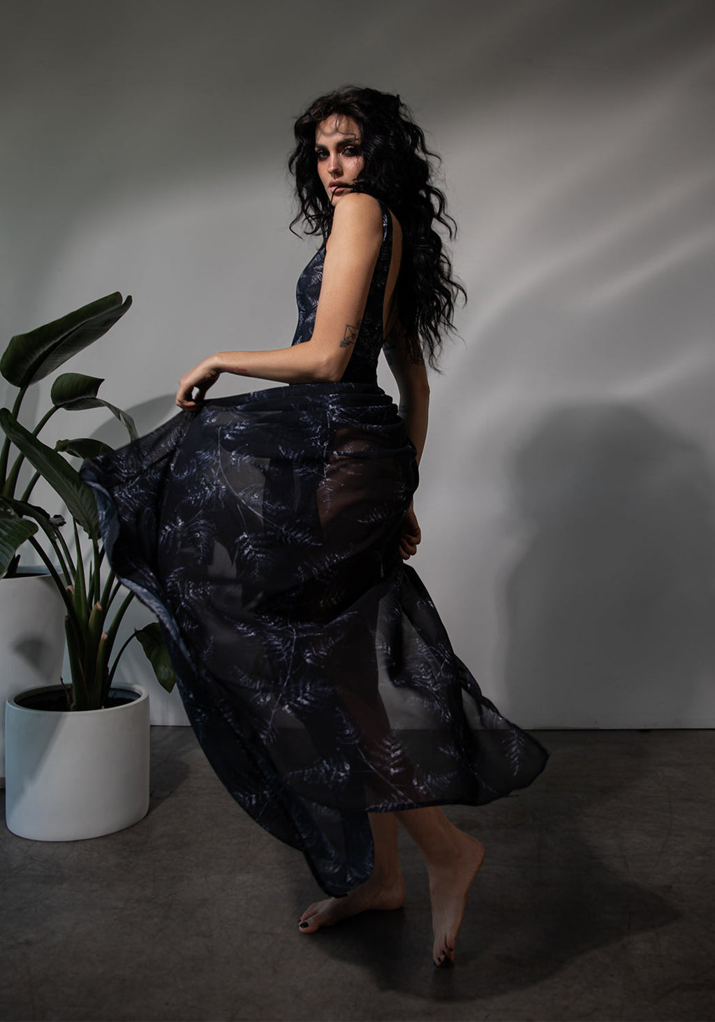 - Light, airy black chiffon in an all-over monochromatic fern print