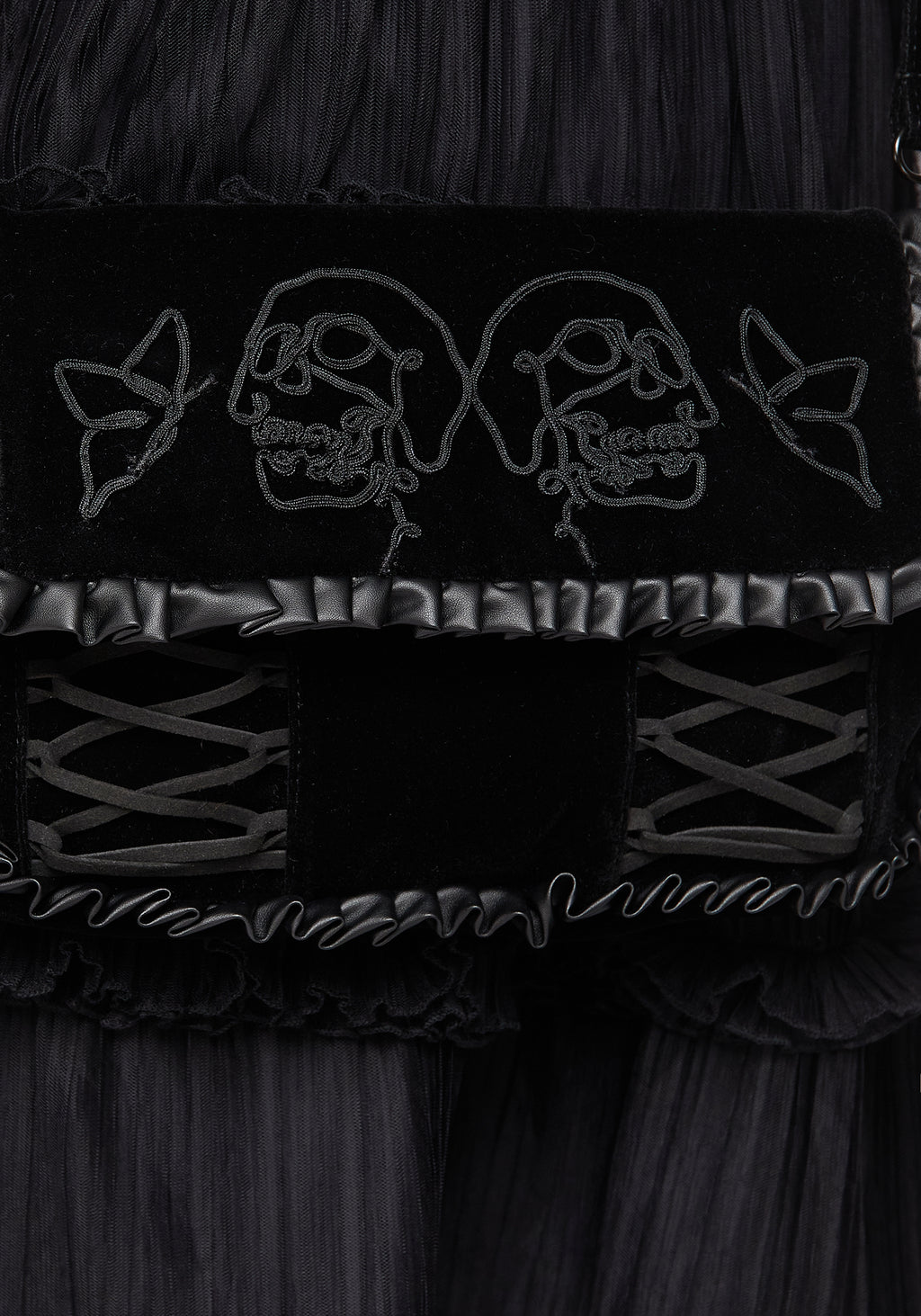 - Line art embroidered skull motif & laced faux suede ribbon feature adorn front