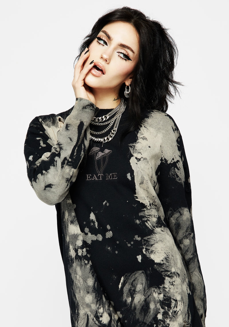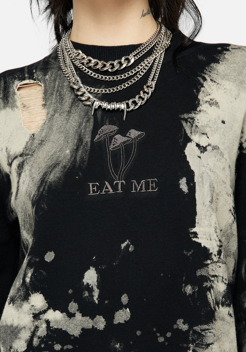 - Metallic mushroom “Eat Me” embroidery on centre front