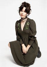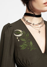 - Woven khaki green fabrication with floral moon embroidery on neckline