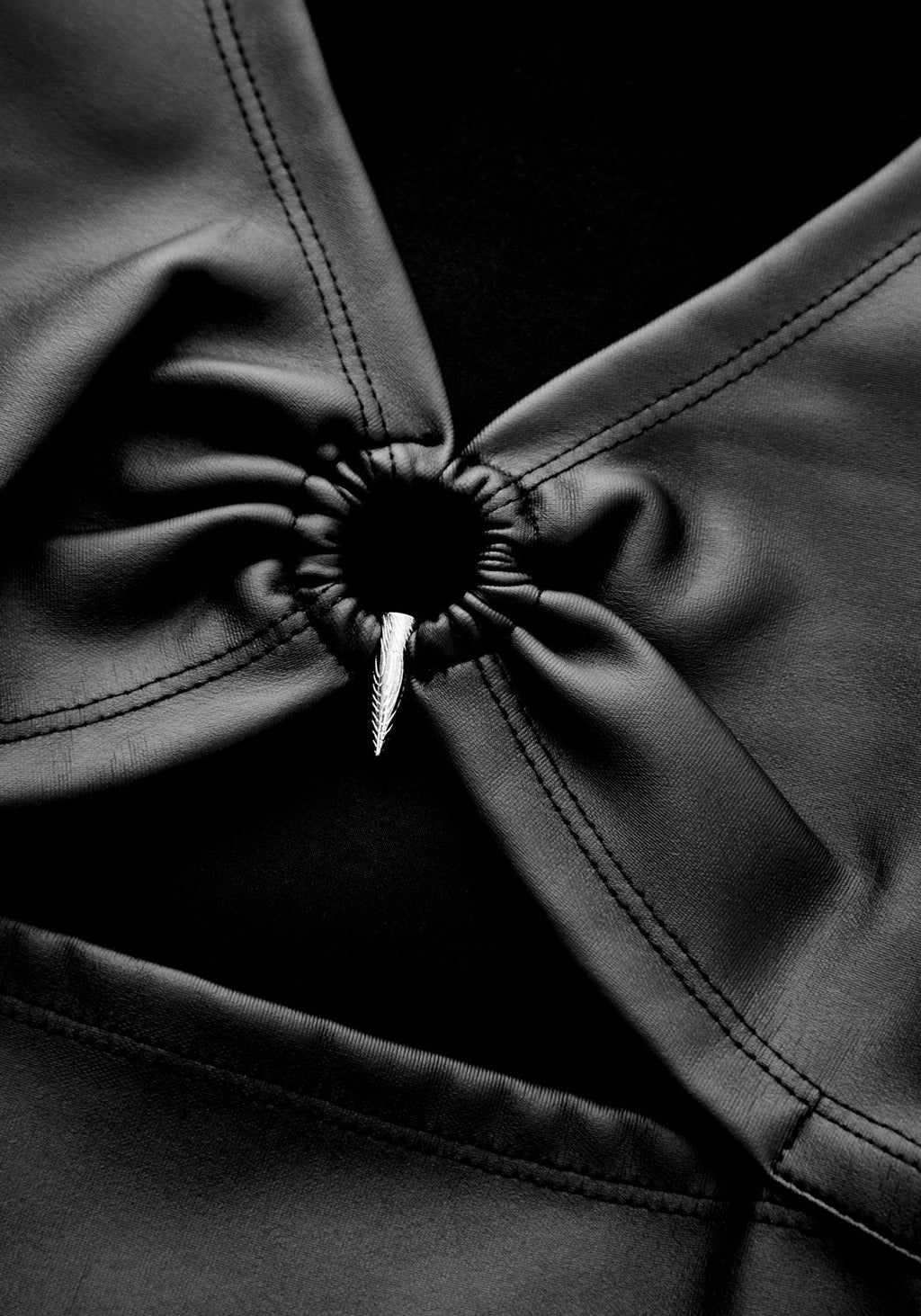 - V-neck and pyramid cut-out gathered at centre with silver O-ring and spiked charm