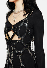 - Diamond shapes created with faux leather straps and silver O-rings to a body-conscious fit