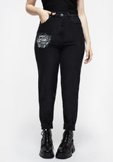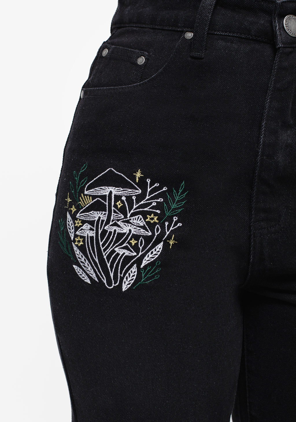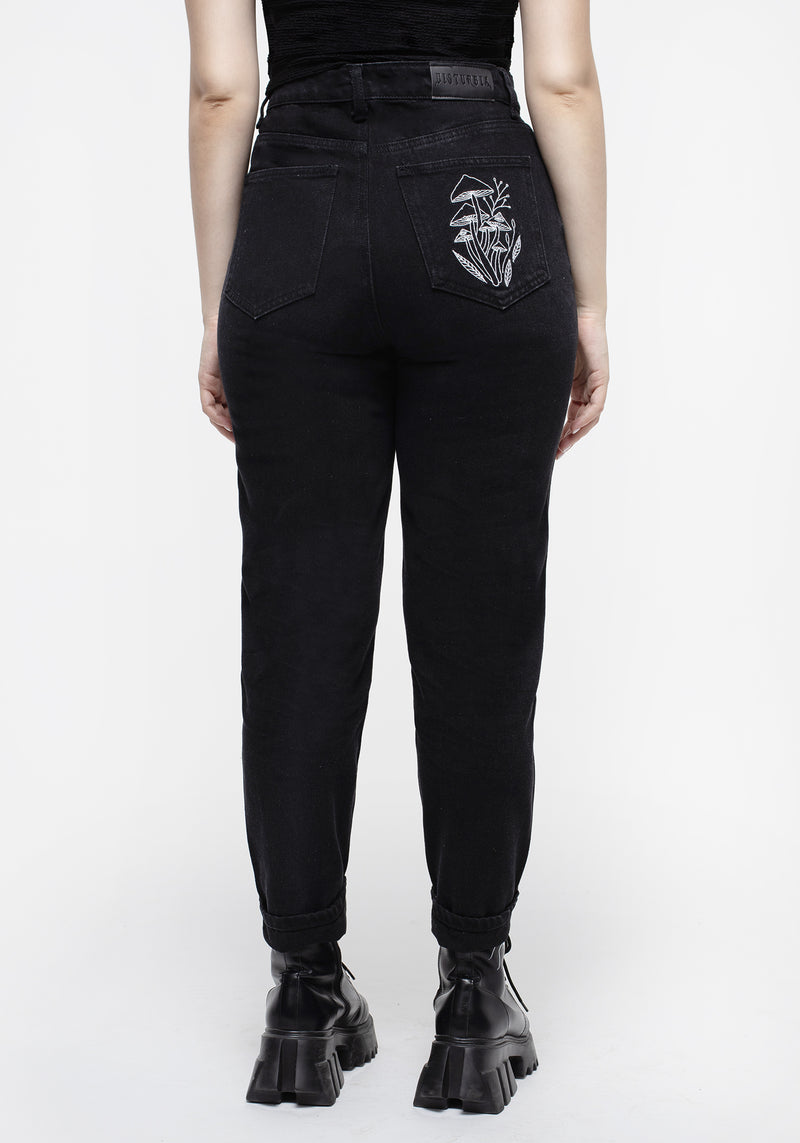 - Black denim mom jeans with mushroom embroidery
