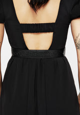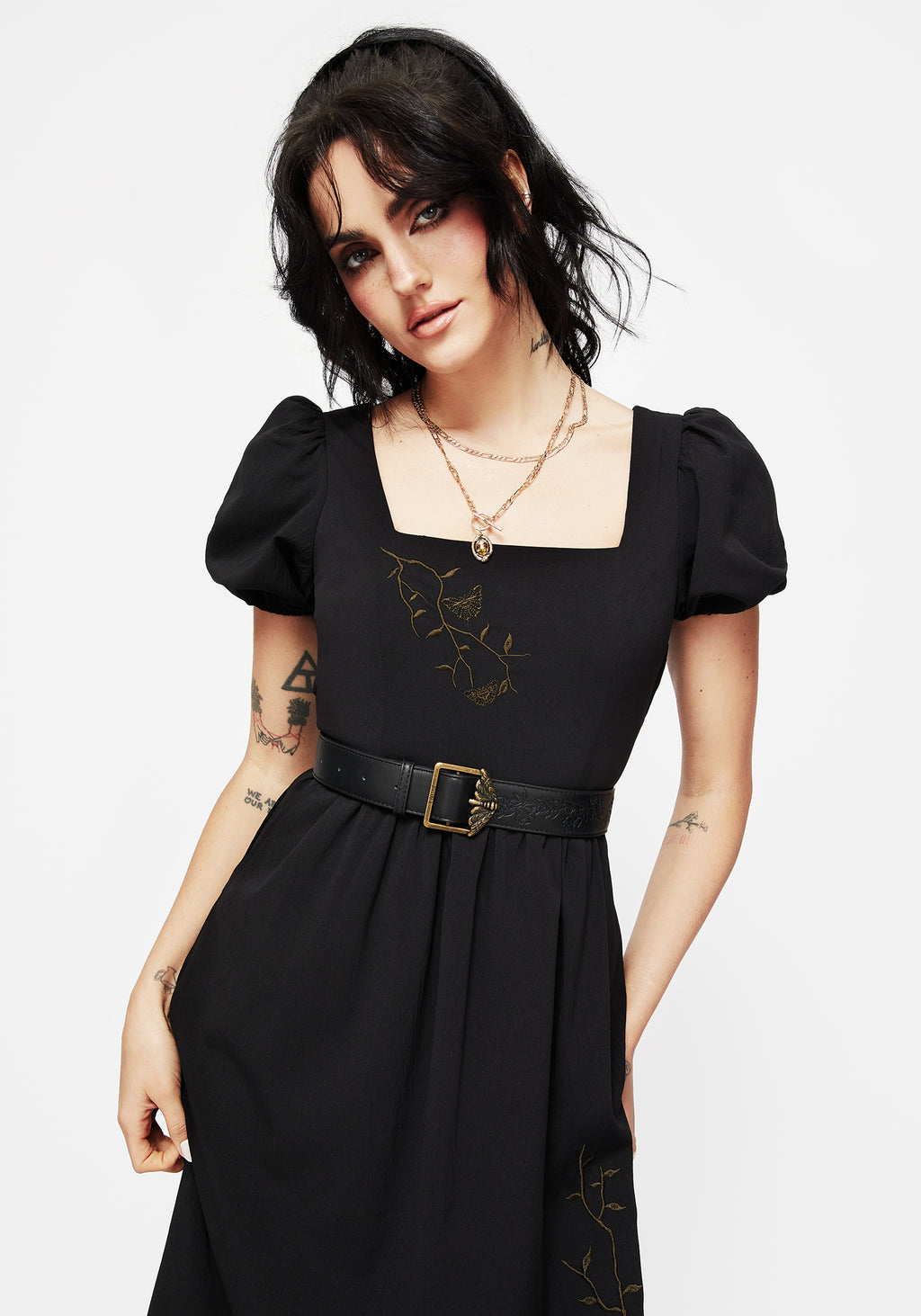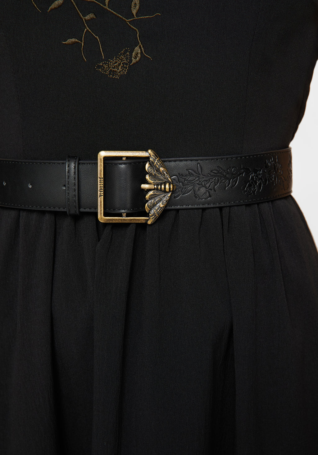 • Black Faux Leather Rose Debossed Jeans Belt with Gold Moth Buckle