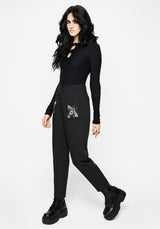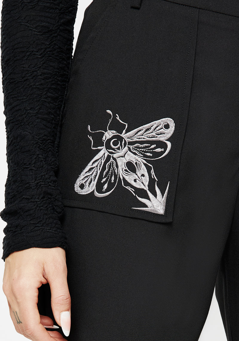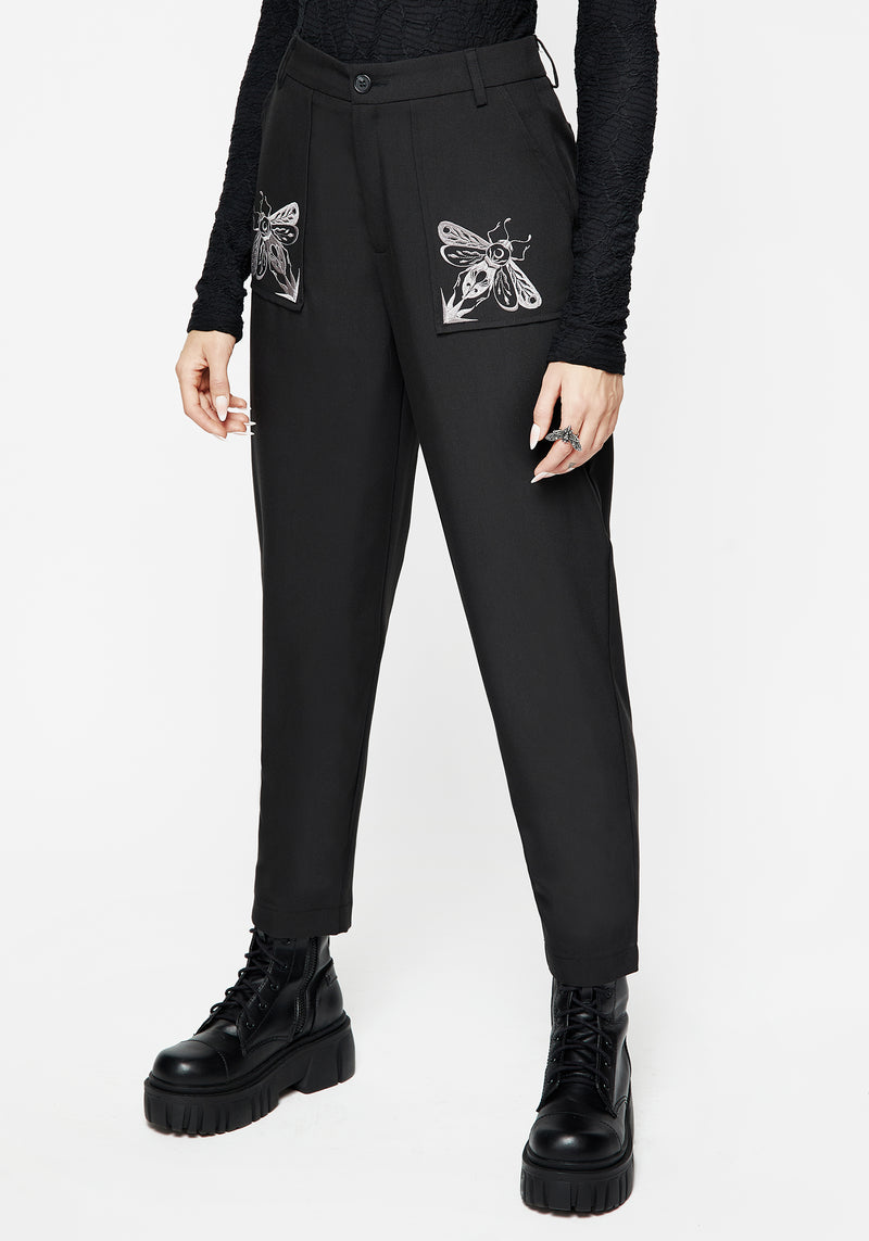 - Black bug embroidered tapered tailored trousers